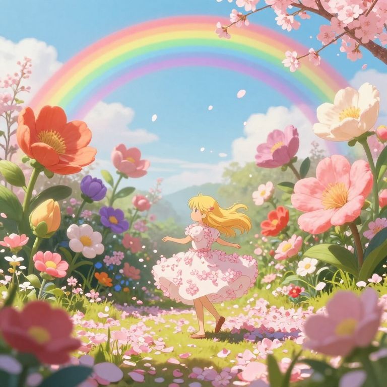Envision an enchanting digital artwork reminiscent of Studio Ghibli's whimsical charm, where a magical garden brimming with oversized, vivid flowers flourishes beneath the captivating embrace of a double rainbow. In this mesmerizing scene, a young girl with cascading golden tresses and a dress woven from blooming cherry blossoms gracefully waltzes among the petals as she engages with the ethereal surroundings. The viewpoint captures the intricate details and textures of the garden's flora from an 'eye-level' perspective, revealing the delicate intricacies of petals and leaves while soft, diffused sunlight casts gentle shadows and highlights, crafting an atmosphere that conveys a sense of wonder, joy, and serenity in perfect harmony.
