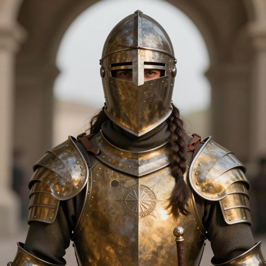 Loyal knight costume, photo of a man in medieval-style, golden armor, wearing a helmet with a visor covering most of his face, long dark braided hair, serious expression, detailed metallic ures, light coming from behind, soft blurred background, realistic CGI style, close-up portrait, medieval knight, fantasy armor, detailed metalwork, realistic lighting, historical fantasy aesthetic