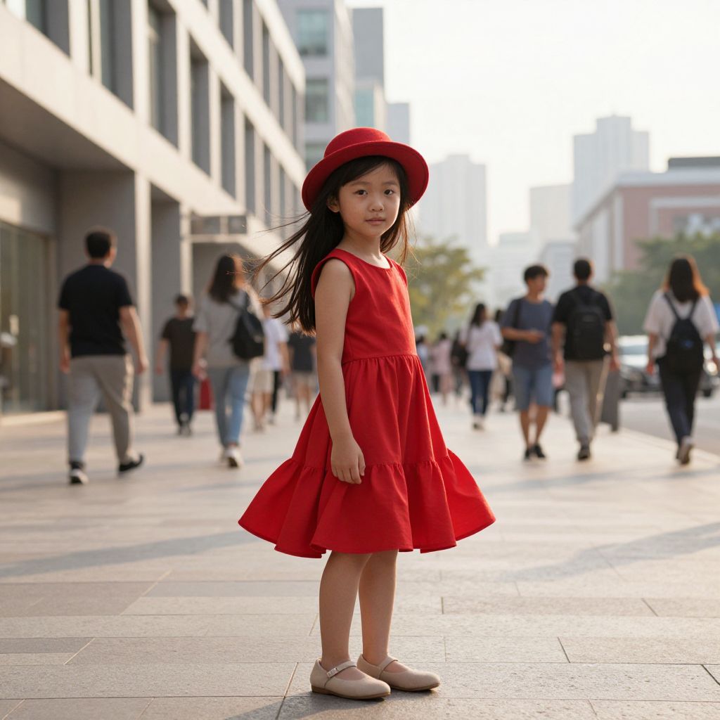 Photograph of a young Asian girl in a red dress and matching hat, standing in a sunlit urban street, surrounded by blurred pedestrians.
