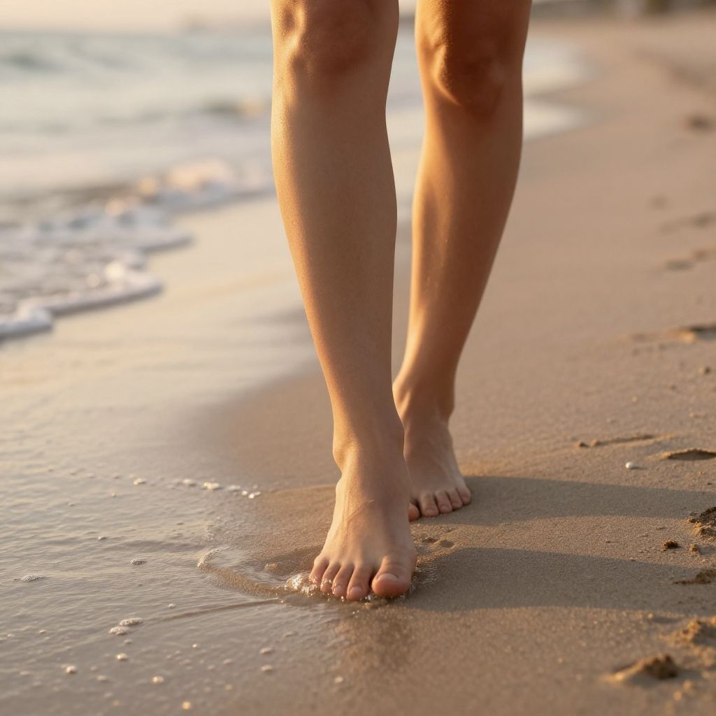 Beautiful bare feet walking on soft sandy beach at sunset, golden light reflecting on smooth skin, gentle waves touching toes, dreamy and serene atmosphere, high detail