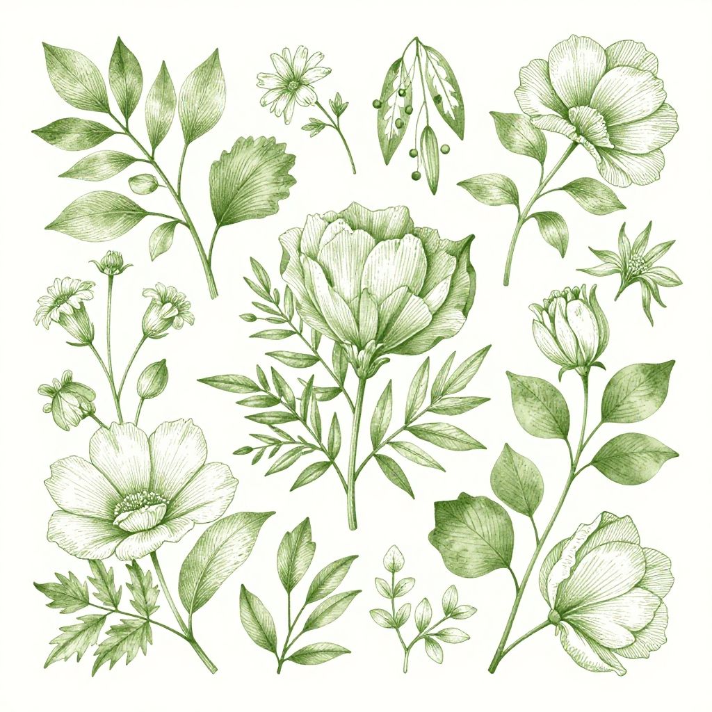 Green aesthetic flowers arranged in a vintage botanical illustration style, fine linework and soft watercolor textures, lush foliage and various shades of green leaves, elegant composition with symmetrical patterns, natural light highlighting the floral shapes, calming nature vibe