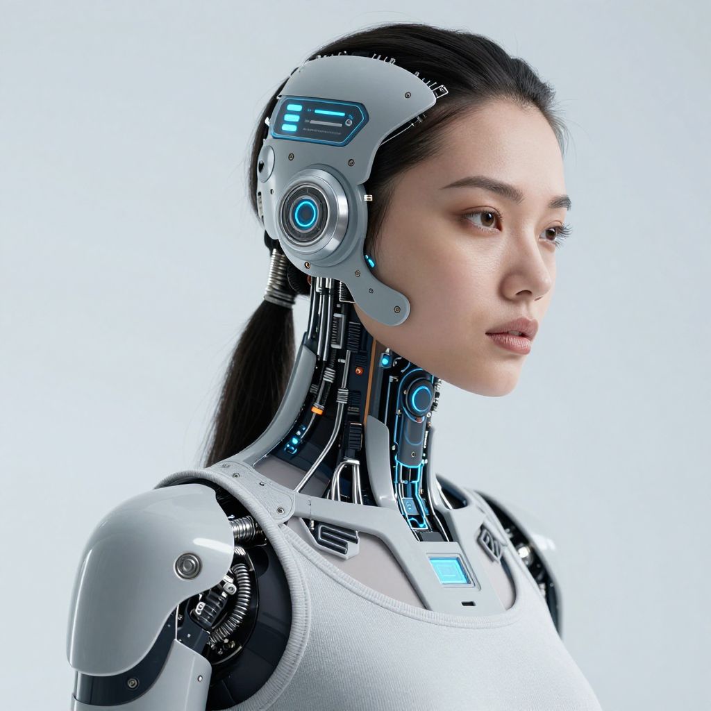 Photorealistic digital artwork of an East Asian woman with long black hair, wearing a high-tech, cybernetic robotic headpiece and upper body. Her expression is neutral, gazing to the right. The cybernetic components are silver with blue LED lights, and the exposed internal wiring is black and orange. She has a smooth, light skin tone and is dressed in a white, form-fitting, futuristic bodysuit. The background is a clean, bright white, emphasizing the futuristic and high-tech theme of the image. The overall style is hyper-realistic sci-fi.