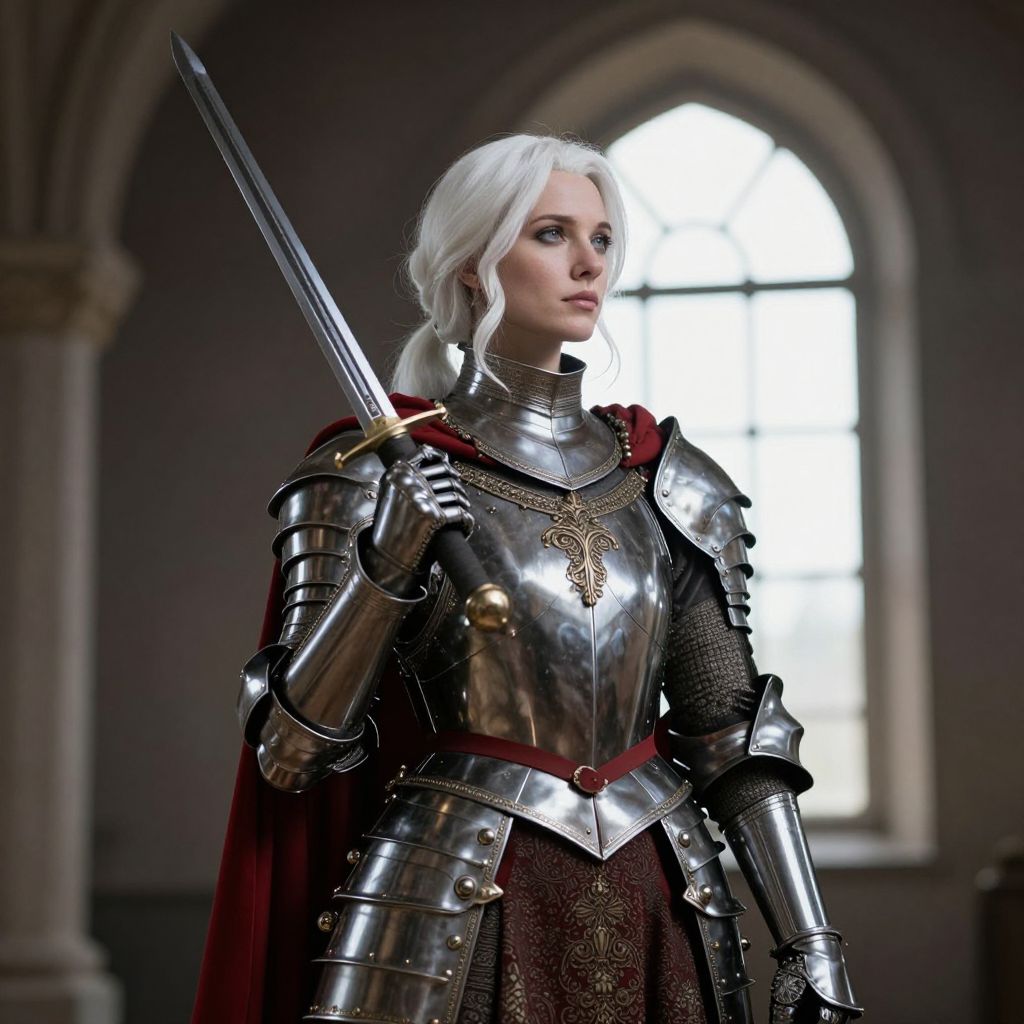 Photorealistic digital artwork of a fair-skinned woman with black-and-white wavy hair, wearing ornate golden medieval armor, standing against a glowing
