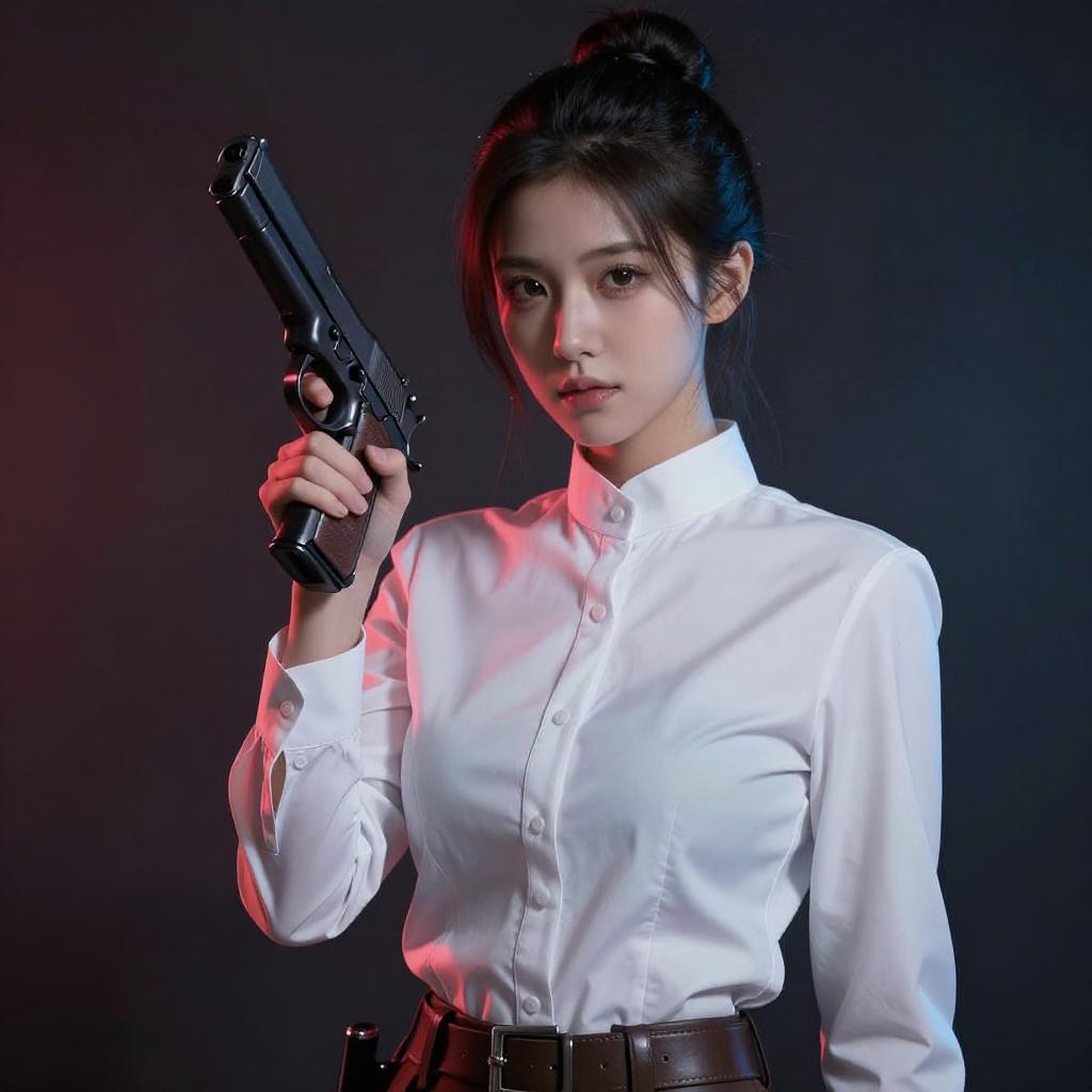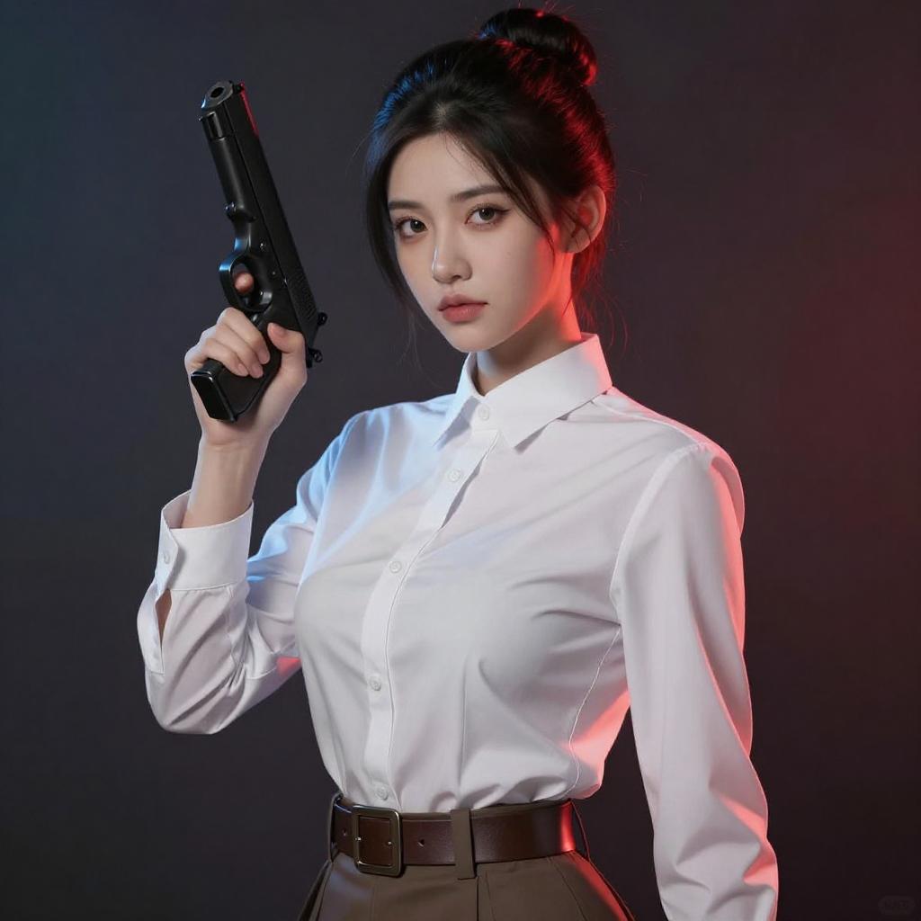 A digital rendering of a young woman with fair skin and dark hair in an updo, wearing a white, high-collared, long-sleeve shirt with a brown belt. She holds a black gun to her right shoulder, pointing with her left hand. The background is dark with red and blue lighting, creating a dramatic effect.
