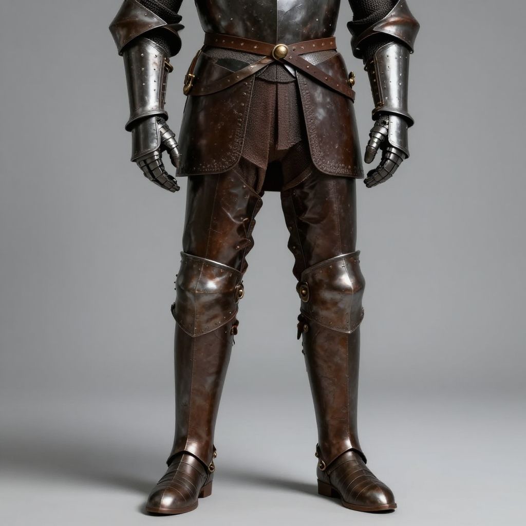 Photograph of a medieval-style armored mannequin with shiny metallic gauntlets, brown leather pants, and boots, standing against a plain gray background