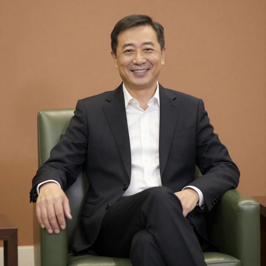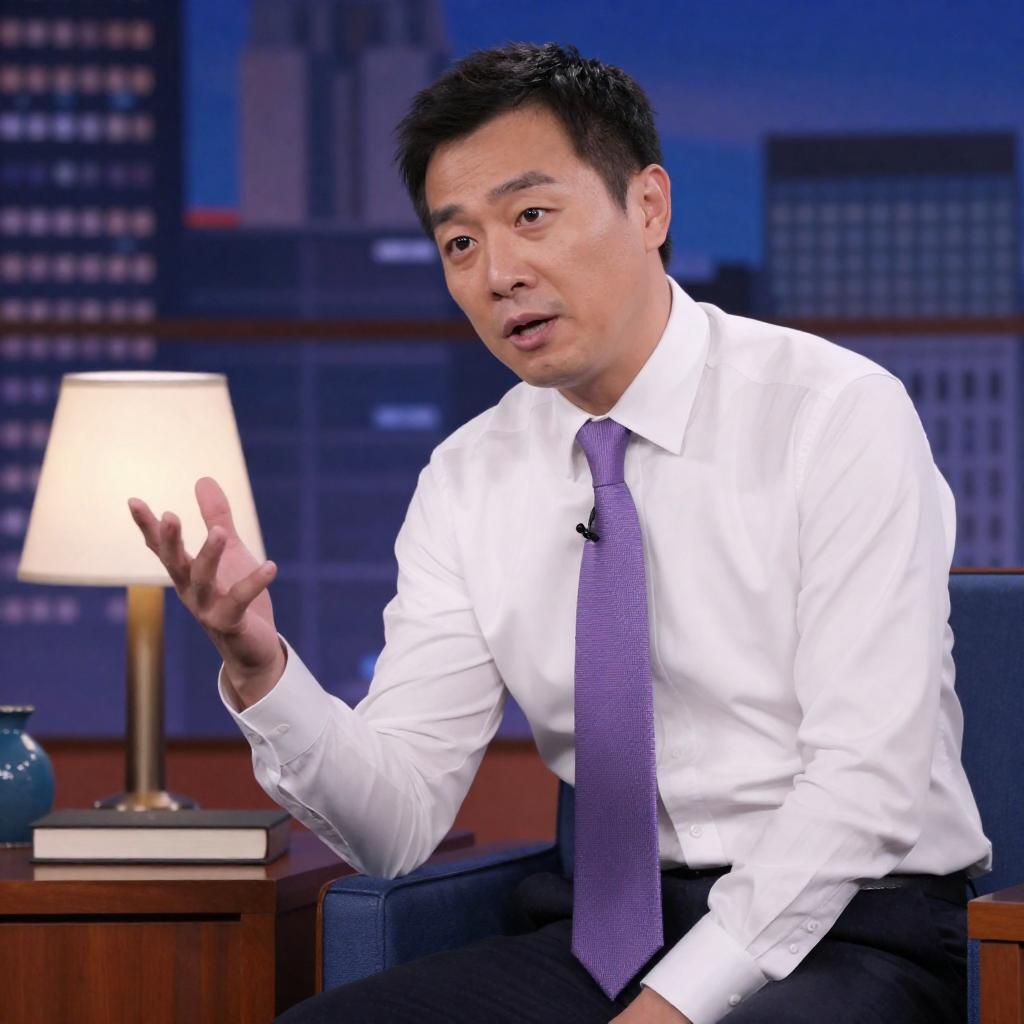 Man in blue suit, black shirt, standing with hands raised, intense expression, dark wood-paneled background, wooden table on right, bright light from right.