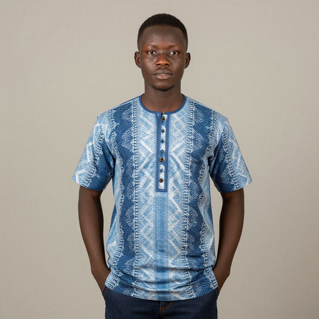 Photograph of a young Black man with a medium-dark skin tone, short-cropped hair, and a serious expression. He is wearing a light blue, short-sleeved, button-up shirt with a geometric pattern and dark blue jeans. His hands are in his pockets, and he stands against a plain, light beige background. The shirt's fabric appears slightly shiny, and the pattern features white and darker blue lines. The image is well-lit with even lighting, highlighting the subject's facial features and the details of his clothing.