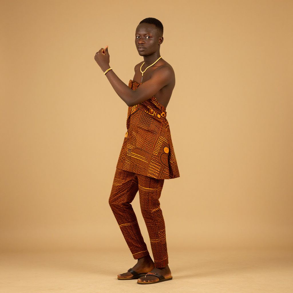 "african traditional clothing, 1boy, solo, male focus, realistic, black hair, dark-skinned male, looking at viewer, hands in pockets, simple background, dark skin, upper body, shirt Realistic photo of casual sexy person with pretty face"