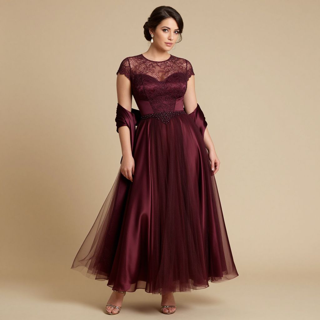 Full body shot, Pear-shaped body type woman, elegant empire waist dress, rich burgundy silk fabric, delicate lace overlay, cap sleeves, high neckline, flowing A-line skirt, intricate beading at the waist, soft tulle underskirt, matching silk shawl, strappy metallic heels, vintage pearl earrings, classic updo hairstyle, subtle makeup, warm ambient lighting Sexy. Pretty face and beаutiful eyes. Big breasts