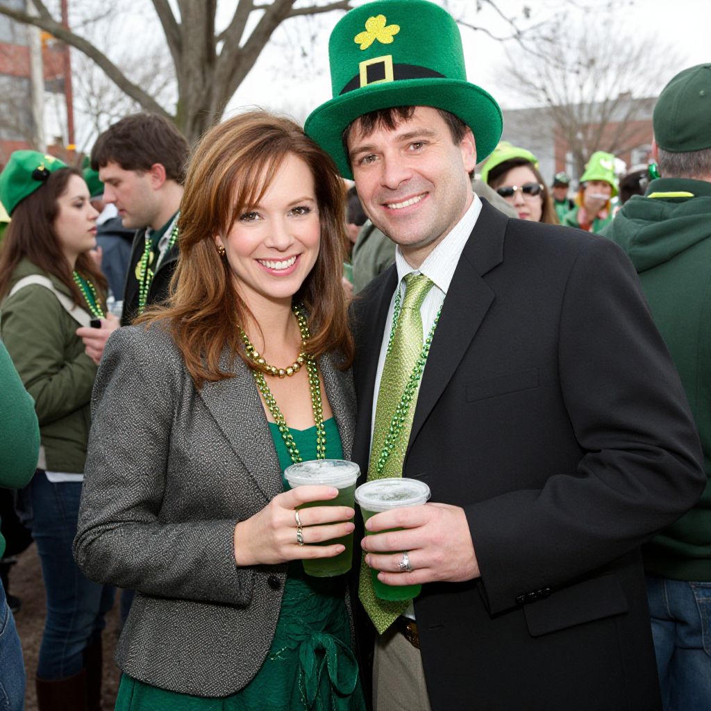 Cleveland, 2009: A festive couple celebrates St. Patrick's Day, with the man wearing a green hat and tie while holding a green drink, and the woman dressed in a stylish gray blazer and green skirt, both smiling warmly amidst a lively crowd.