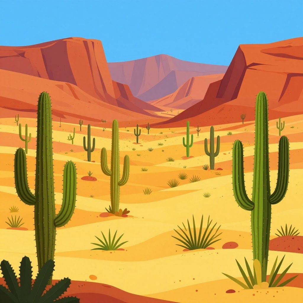 Digital illustration of a vibrant desert landscape with tall green cacti, sandy yellow ground, red-orange rocky hills, and a clear blue sky.