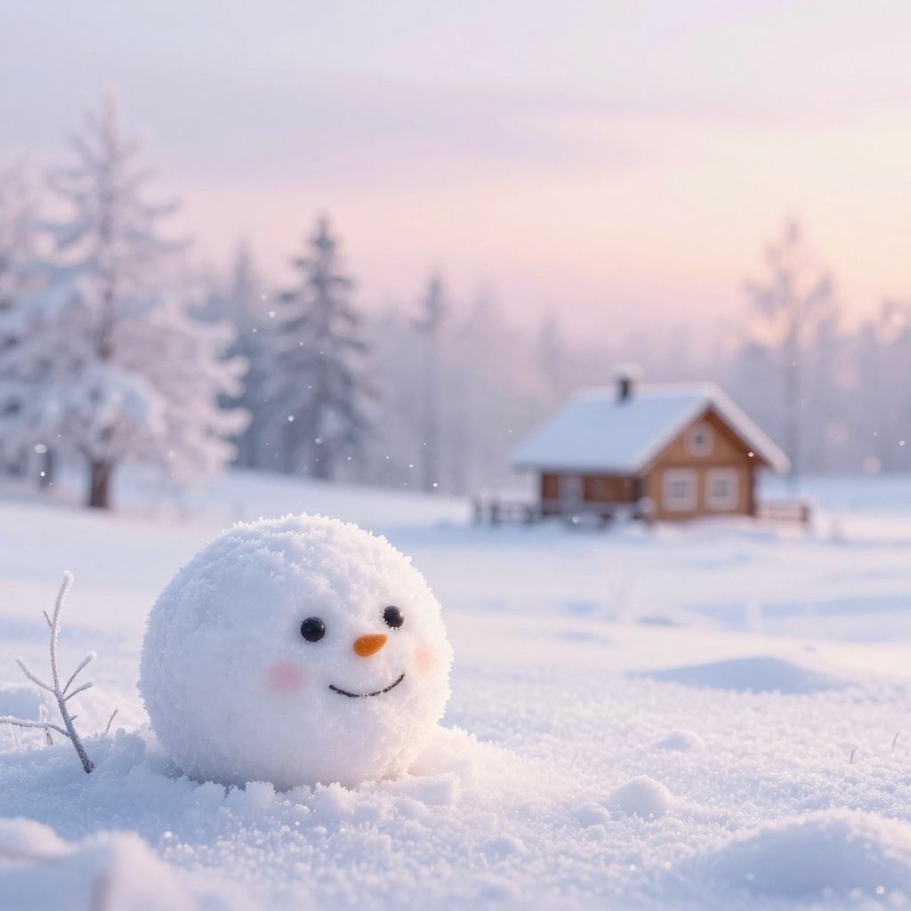Snowball background with soft falling snowflakes, gentle winter landscape, cozy cabin in distance, warm glow, pastel colors, serene and peaceful atmosphere, detailed frost on trees.
