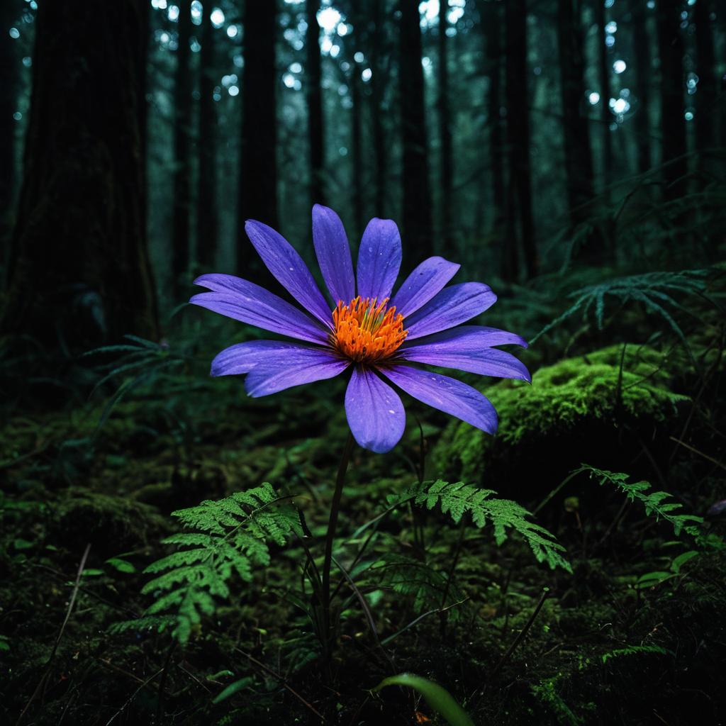 A single tall purple flower with a bright orange center glowing softly in a dark, enchanted forest. The flower is surrounded by lush green foliage and moss-covered ground, with natural ambient light filtering through dense, blurred trees in the background. The scene exudes a mystical and serene atmosphere with vivid details and bioluminescent effects highlighting the flower petals.