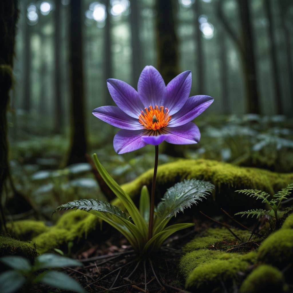 A single tall purple flower with orange center glowing softly in a dark, enchanted forest, surrounded by green and mossy ground cover, vivid detailed petals, bioluminescent effect, natural ambient light filtering through dense trees, mystical and serene atmosphere