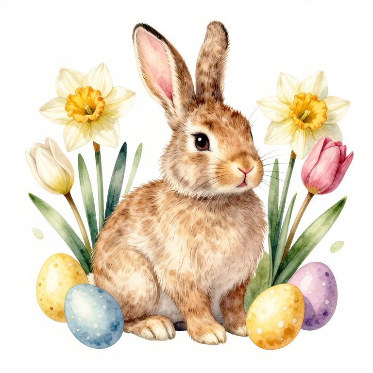 Illustration of a fluffy brown rabbit with upright ears, surrounded by colorful Easter eggs and yellow and pink tulips.