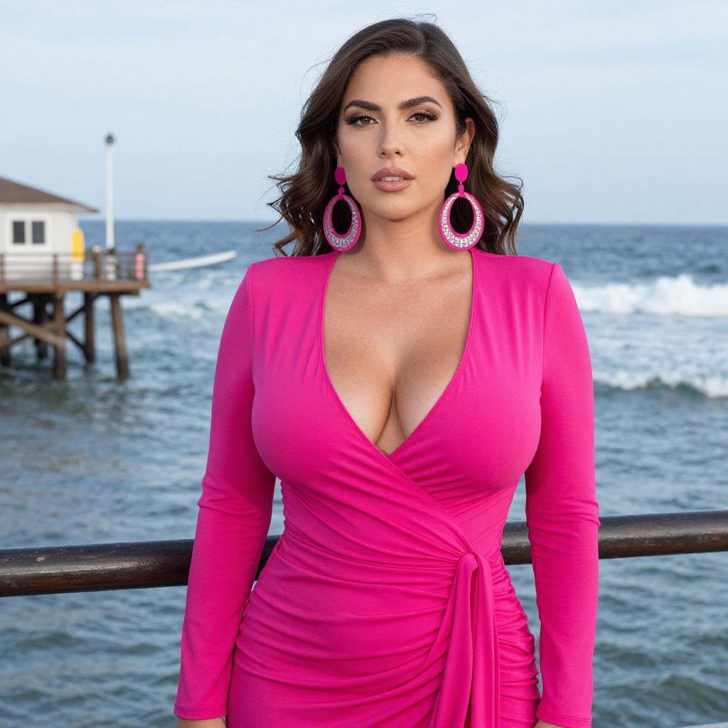Photograph of a curvy, light-skinned woman with long, wavy brown hair, wearing a form-fitting, hot pink dress with a deep V-neck, showcasing her large breasts. She has pink, rhinestone-studded hoop earrings and stands against a blurred ocean background with waves and a wooden pier. Her expression is confident and she gazes directly at the camera. The dress has long sleeves and a ruched waist, adding texture to her outfit. The image has a slight digital enhancement, giving it a vivid, almost hyper-realistic quality.