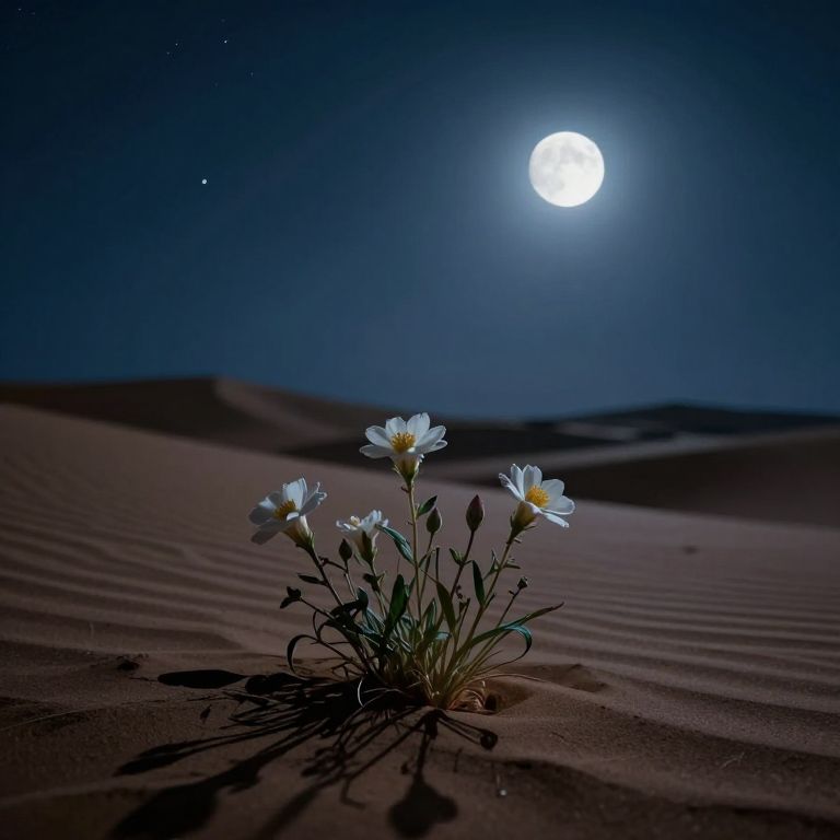 In the hushed embrace of a starlit desert, delicate flowers bloom under the moon's tender gaze, their whispers weaving a symphony that dissolves sand into ethereal light, evoking a profound sense of serenity and the timeless dance between solitude and wonder.