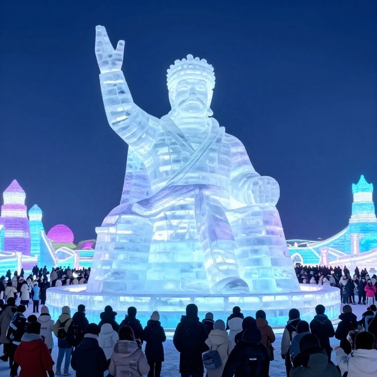 Mr beast statue carved from ice at a winter festival, glowing under soft blue and purple lights, surrounded by snow and cheering crowd, magical atmosphere