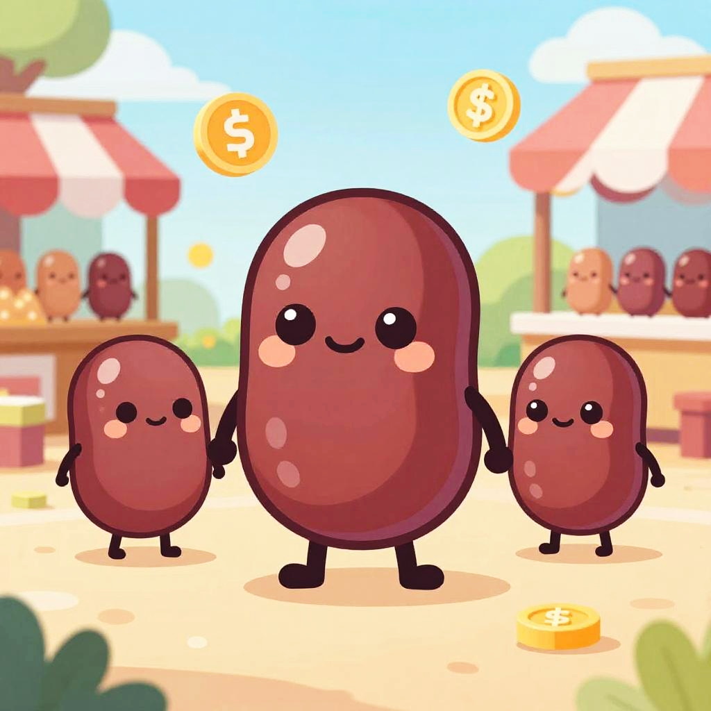Azuki beans NFT design portraying cute anthropomorphic azuki beans characters in a digital marketplace setting, rendered in bright colors with cartoonish charm, surrounded by cryptographic symbols and blockchain motifs to emphasize their collectible nature.