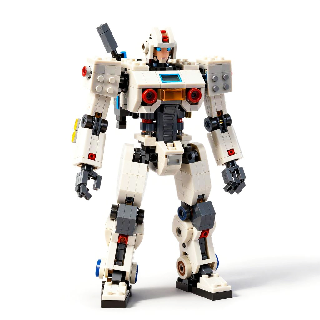 BJ_Lego bricks, solo, standing, no_humans, robot, mecha, science_fiction, open_hands, cinematic lighting, strong contrast, high level of detail, Best quality, masterpiece, White background