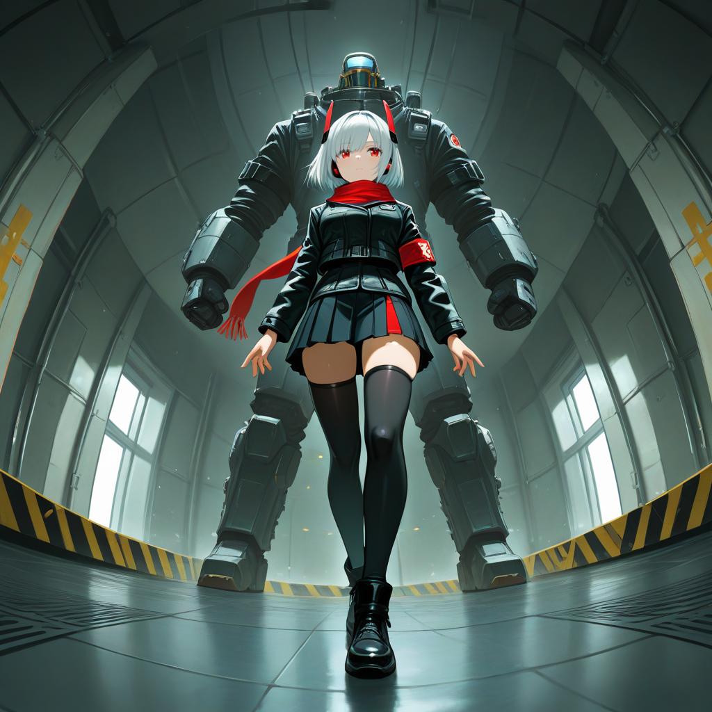 Digital artwork of an anime-style girl with silver hair and red eyes, wearing a black jacket, short pleated skirt, red scarf, and thigh-high black stockings. She has a red armband on her left arm and distinct headgear with red accents. Behind her stands a large, armored robot in a futuristic tunnel with arched walls and windows, creating a dramatic size contrast. The perspective is low and fisheye, enhancing the looming effect of the robot and the girl's confident pose.