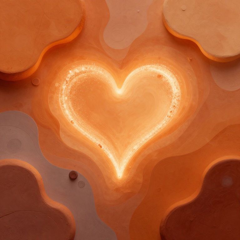 A photograph depicting a glowing, heart-shaped light at the center, surrounded by an orange and red marbled surface with wavy, organic patterns. The light is bright and warm, creating a sense of warmth and love. The marbled background has varying shades of orange and red, with small droplets of liquid visible on the surface. The heart-shaped light is the focal point, emitting a soft, radiant glow that contrasts with the darker, textured background. The overall composition evokes feelings of warmth, love, and organic beauty.