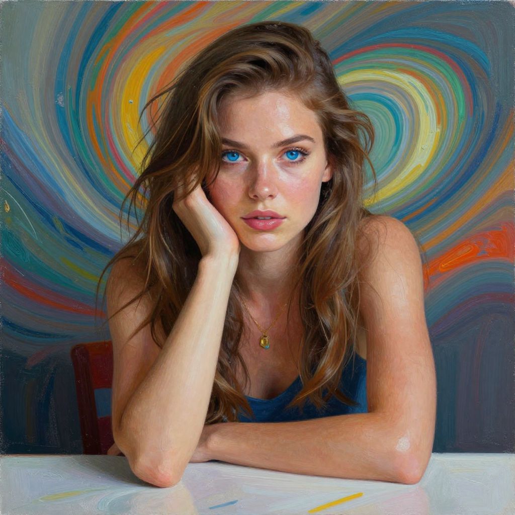 A captivating illustration of a woman with striking blue eyes, seated at a table with an expressive background of swirling colors. The artwork combines realism and vibrant painterly elements, showcasing a unique blend of contemporary style and emotional depth.