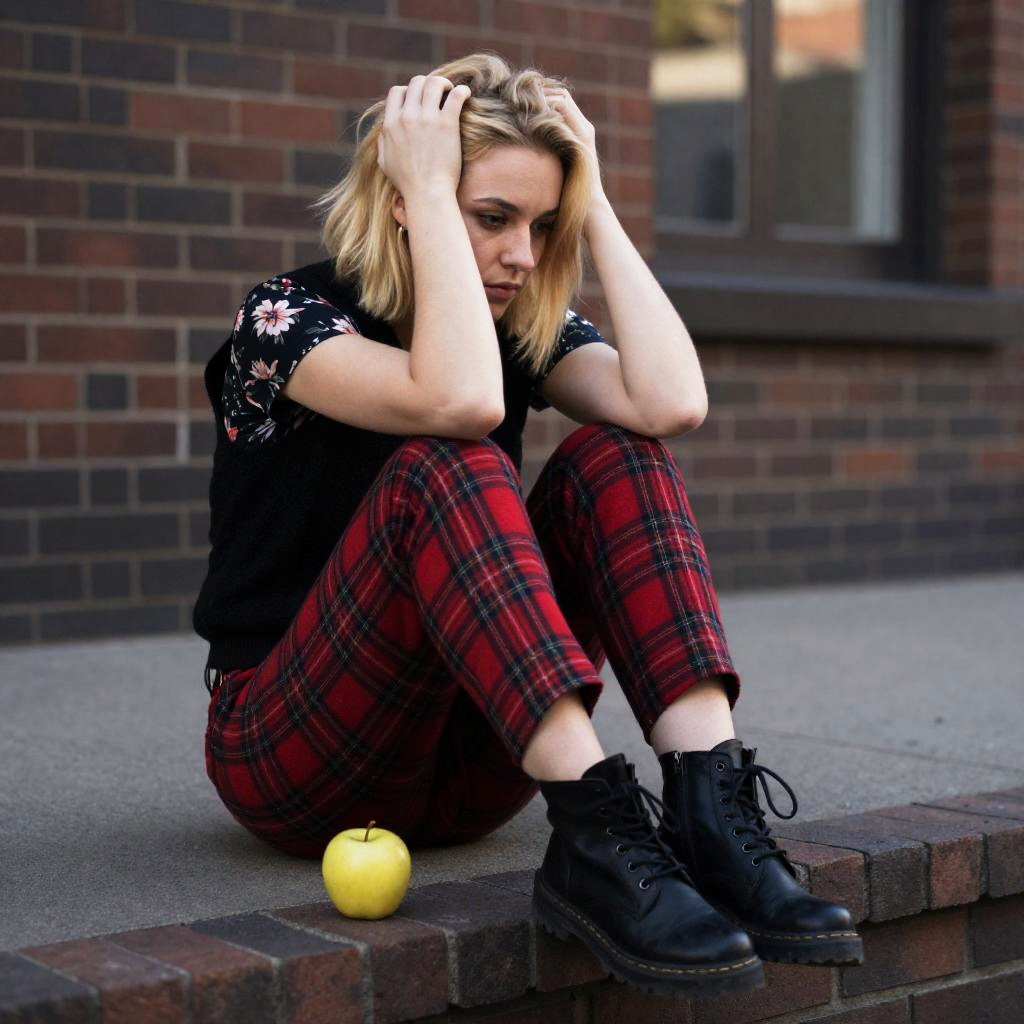Photograph of a young woman with short blonde hair, sitting on a brick ledge, arms wrapped around knees, hands on head. She wears a floral shirt, black vest, and red plaid pants, black boots. A yellow apple is beside her on the ledge. Background includes a brick wall and a window. She has a pensive expression. Urban setting, daytime.