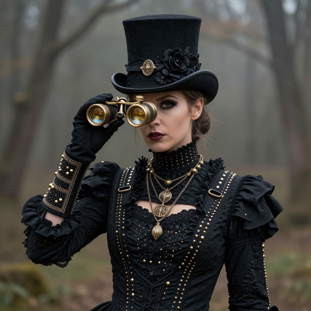 Photograph of a pale-skinned woman with dark brown hair in an updo, wearing a black Victorian-style dress adorned with gold buttons and ruffled sleeves. She also wears a tall black top hat decorated with a silver brooch and a circular embellishment. She holds a pair of brass binoculars to her eyes, looking through them with a focused expression. Around her neck are multiple gold necklaces. The background is a foggy, blurred forest with bare trees. The overall style is steampunk, blending Victorian fashion with industrial elements. The image is sharply focused on the woman, with a soft, muted background.