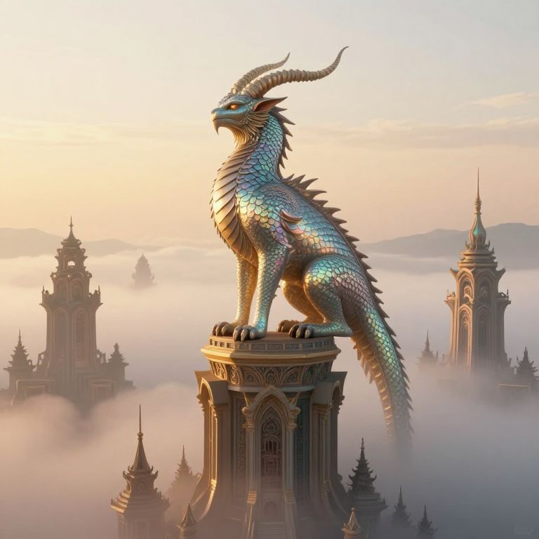 A dreamlike portrait depicting a majestic creature with iridescent scales and a spiraling horn, gracefully perched atop an intricately designed tower. The scene's illogical geometry and distorted perspective create an emotional gradient evoking both wonder and unease, as the ethereal being seems to emerge from the soft fog enveloping the surreal landscape. Warm, golden hour lighting gently illuminates the intricate details of the creature's form and the fantastical architecture, blurring the line between reality and imagination in this whimsical yet thought-provoking vision.