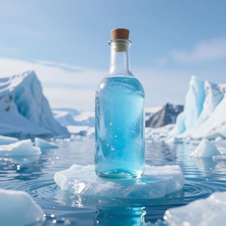 A translucent bottle of ethereal blue liquid emerges from a shimmering iceberg, defying gravity as it floats serenely amidst a surreal Arctic landscape where ice and water blend into a dreamlike, otherworldly scene.