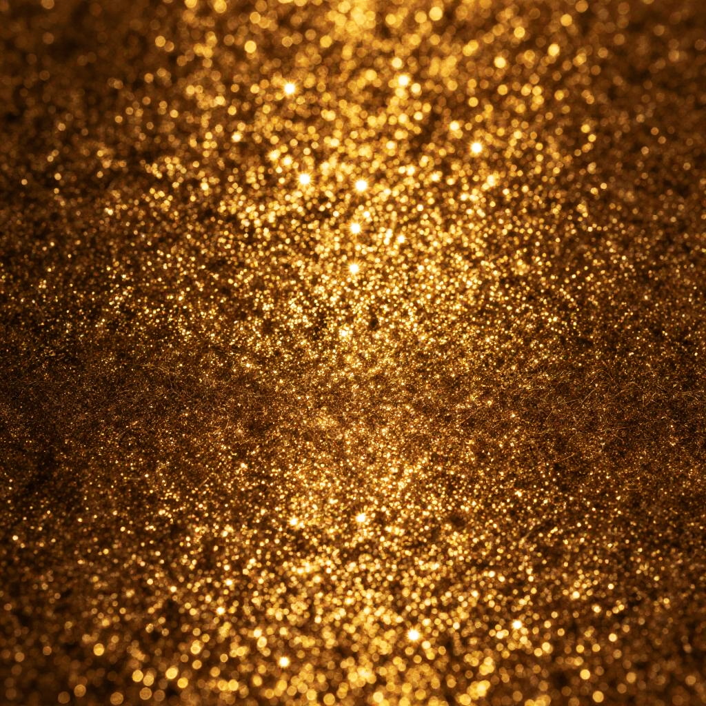 Photograph of a dense, shimmering golden glitter spread across the entire frame. The glitter particles are varying in size, creating a textured, sparkling effect with intense, bright golden light reflecting off them. The background is a dark, almost black, contrasting surface that makes the golden glitter stand out more vividly. The image has a rich, warm tone with a bokeh-like effect, where some particles appear more blurred than others, adding depth and movement to the glitter. The overall composition is vibrant and eye-catching, emphasizing the sparkle and glow of the golden glitter.