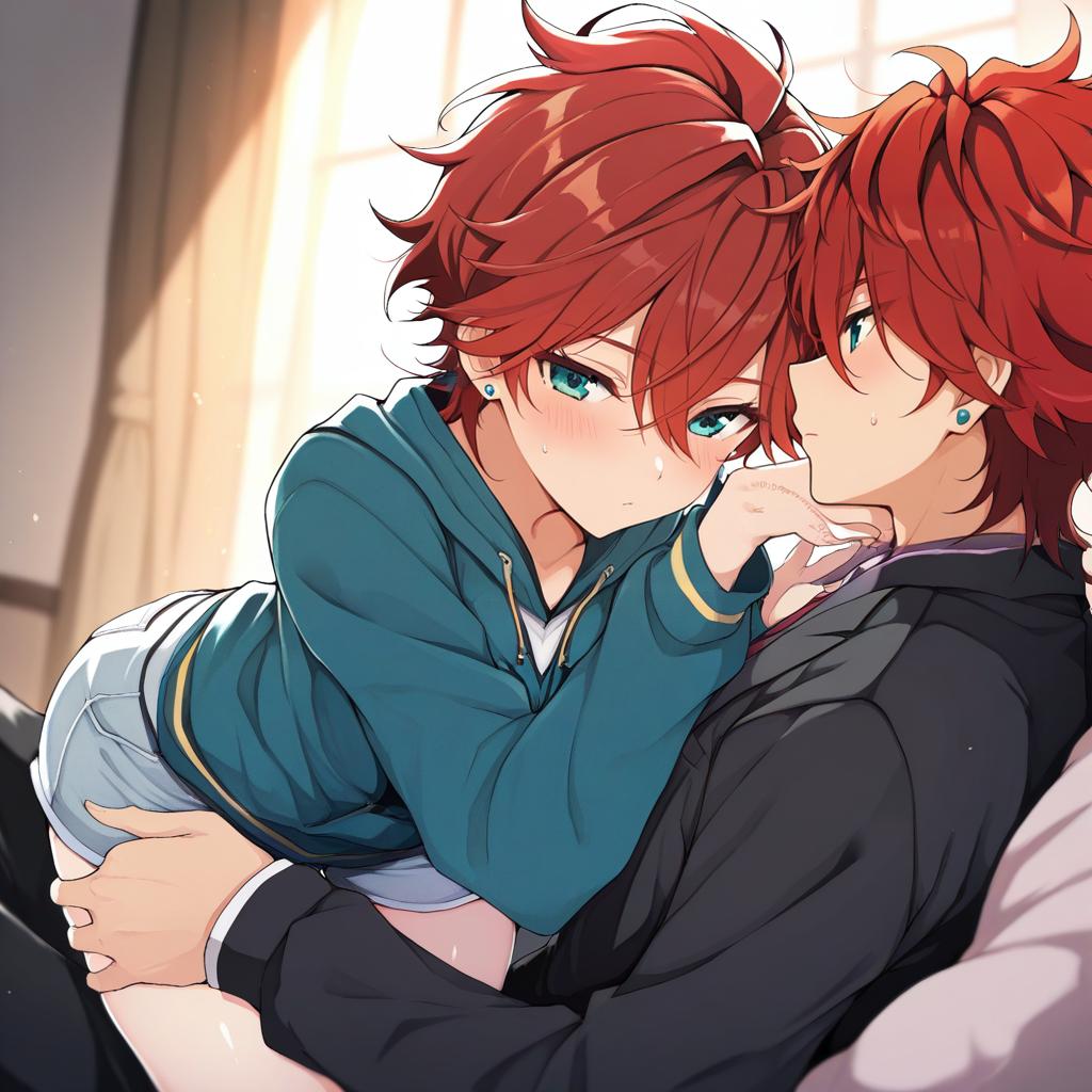 Digital anime illustration featuring two young male characters with red hair and aqua blue eyes in an intimate pose. One boy is wearing a teal hoodie and light shorts, while the other wears a black jacket. Both have short hair and are adorned with earrings. The background shows soft daylight filtering through a window, adding warmth to the scene.