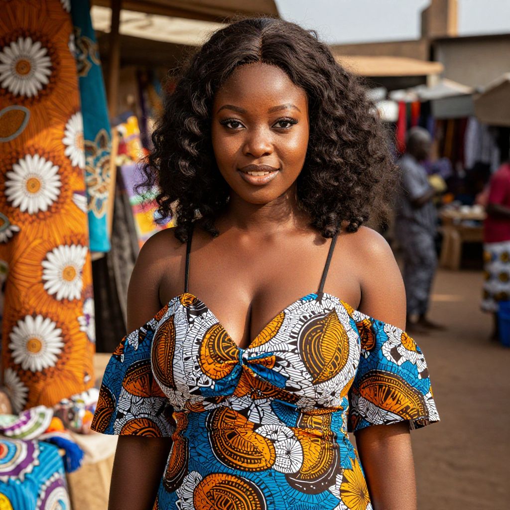 A stunning African dress, costume worn by a young African woman with deep brown eyes, lush curly black hair, and a confident smile, standing in a traditional market in Nigeria, surrounded by vibrant textiles and colorful stalls, natural sunlight casting warm shadows.. The woman has big tits and cute face
