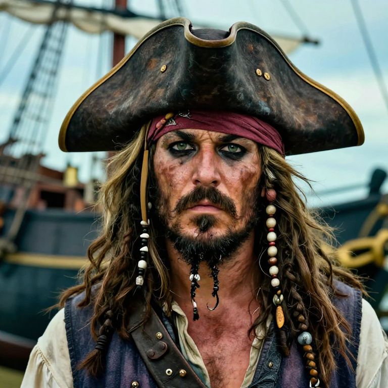 A scraggy beard with wild, patchy growth on a pirate captain, sea weathered skin, tricorn hat, old ship in the background, vibrant colors, detailed textures