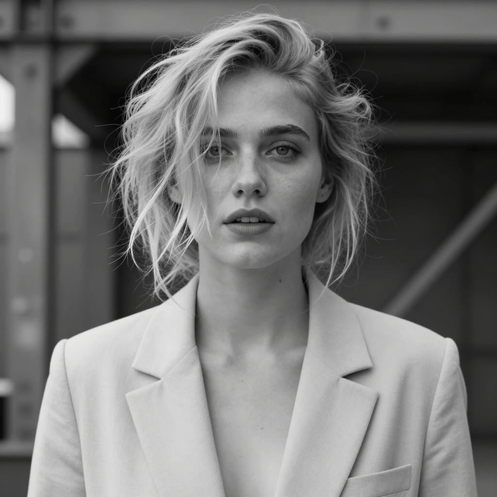 Black and white photograph of a woman with tousled blonde hair, wearing a light-colored blazer. She has a neutral expression, slightly parted lips, and is centered in the frame. Background features blurred, industrial elements with visible metal structures. Her hair partially covers her forehead. She is the primary subject, positioned in the center.
