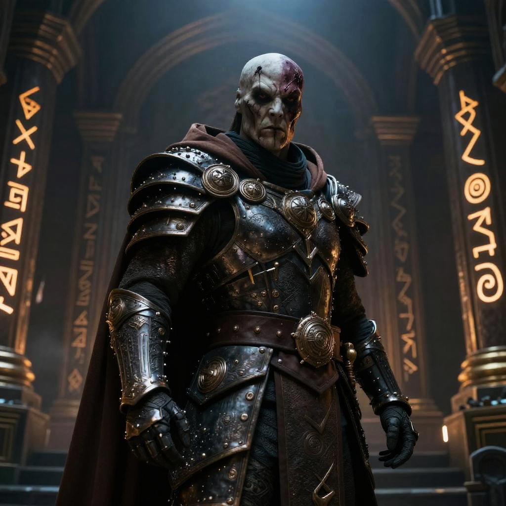 Dr Doom without mask, intense facial expression with battle wounds, wearing a richly textured armored cloak, standing in a dimly lit ancient chamber with glowing runes and mystical fog, dark fantasy environment with epic dramatic shadows and highlights