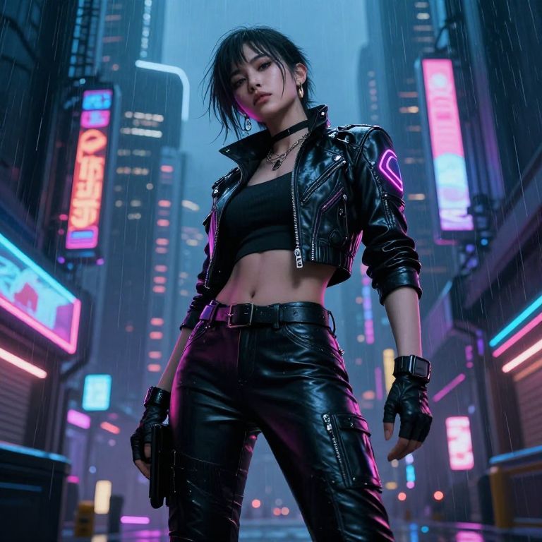 Digital artwork of a tough, Asian woman in a black leather jacket and pants, standing in a neon-lit, rainy cyber-city street, with vibrant