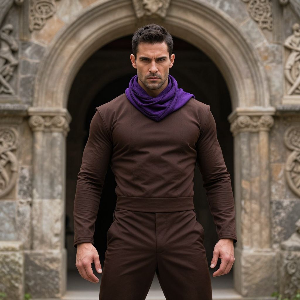 A man with a brown outfit and a purple scarf around his neck, standing in front of a stone archway. The man has a strong, confident presence, with a chiseled physique and intense gaze. His clothing is well-fitted, emphasizing his muscular build, while the purple scarf adds a touch of elegance and mystery. The stone archway is ancient and imposing, with intricate carvings that add to the atmosphere of the scene. The overall mood is dramatic and enigmatic, capturing a moment of quiet intensity.