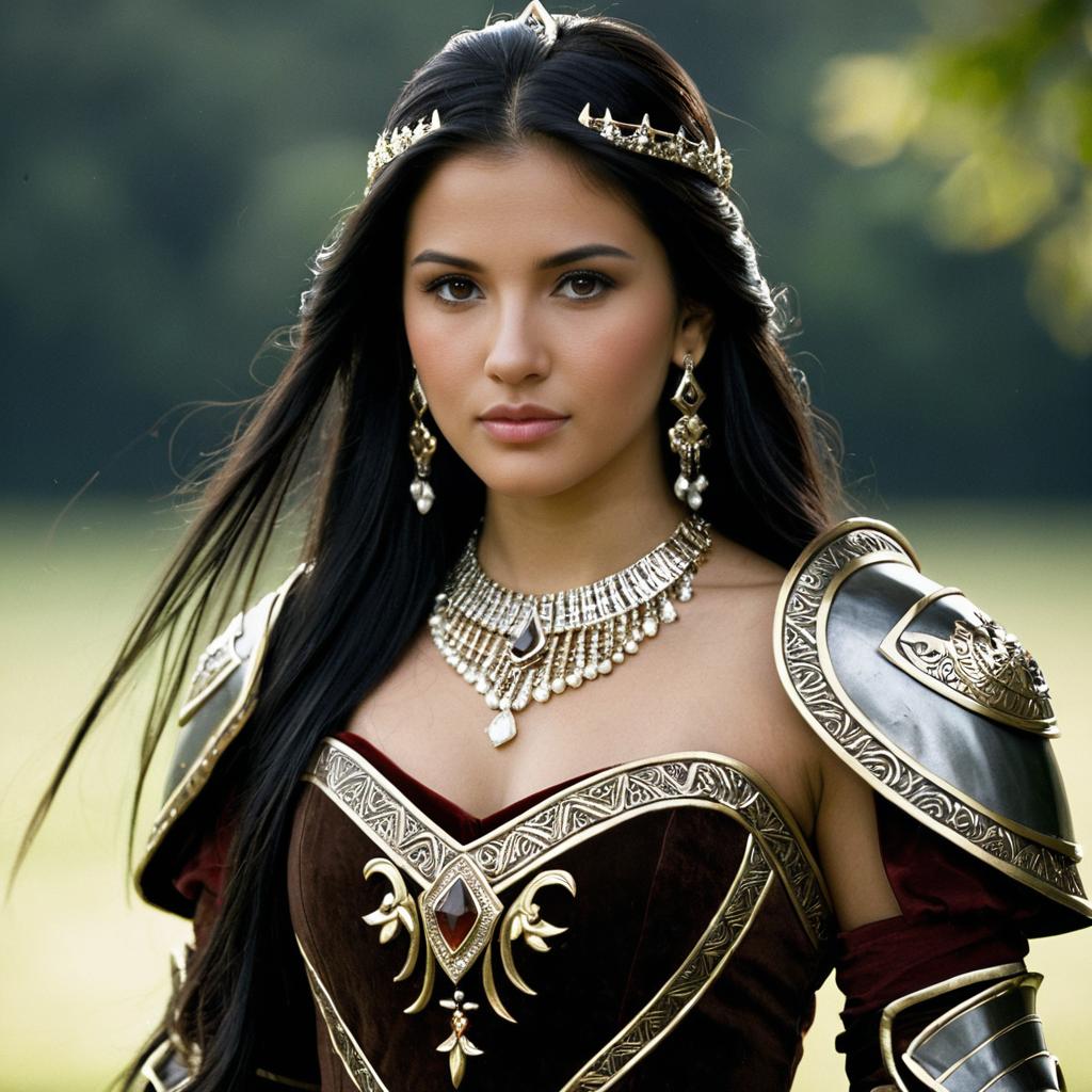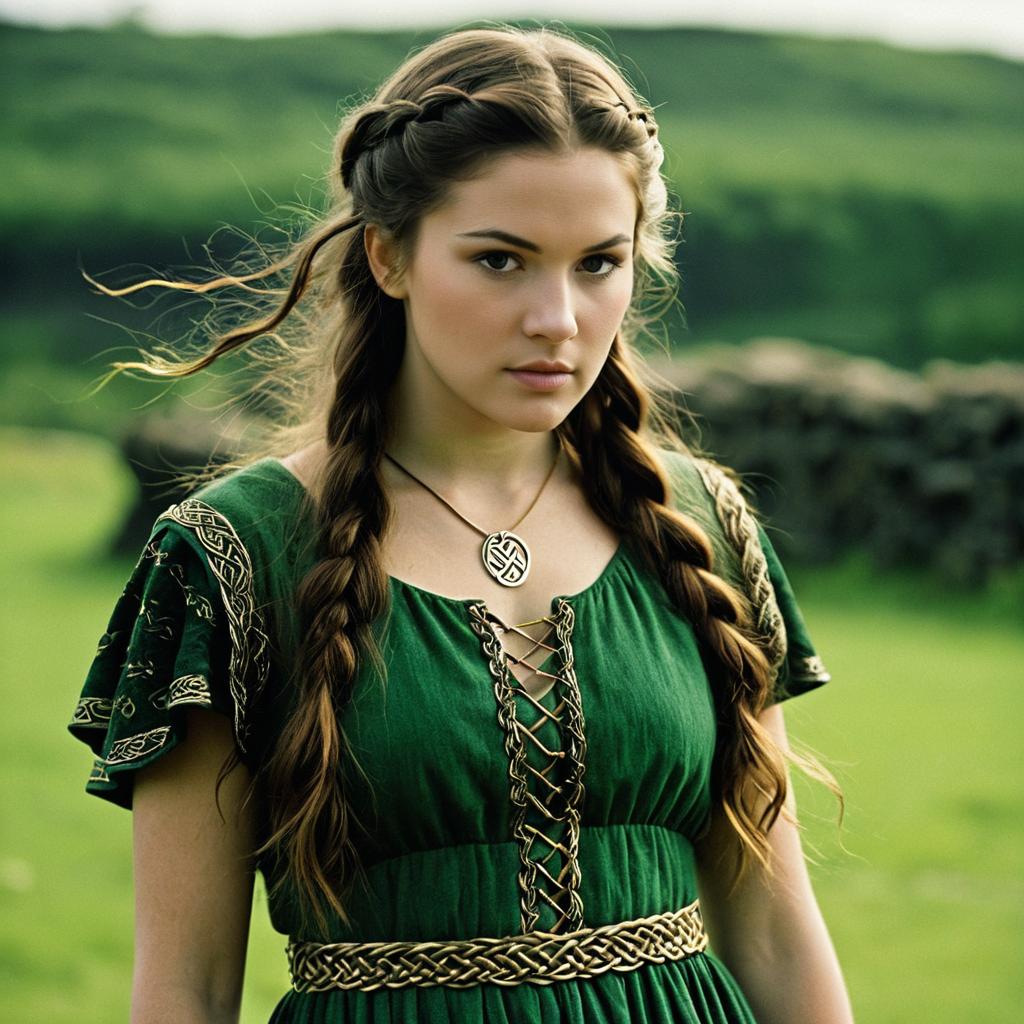 Rogue man movie costume,1girl, dress, brown hair, long hair, green dress, armor, breasts, choker, solo, shoulder armor, belt, blurry, blurry background, outdoors, brown eyes, pauldrons