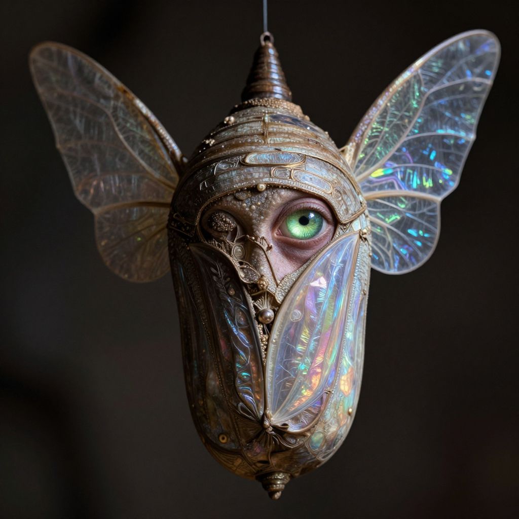 Photograph of a surreal, intricate light fixture resembling a metallic insect face with iridescent, reflective wings. The fixture has a conical top and detailed, textured patterns covering its face, with one large, glowing green eye. The wings are translucent with a shimmering, rainbow-like effect. The background is dark, making the fixture's colors and details stand out vividly. The overall style blends steampunk and fantasy elements, creating a unique, otherworldly aesthetic. The fixture is hanging by a thin wire at the top center.
