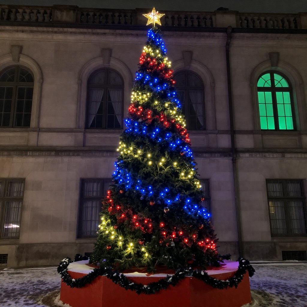 Nighttime Christmas Tree at Stone Building