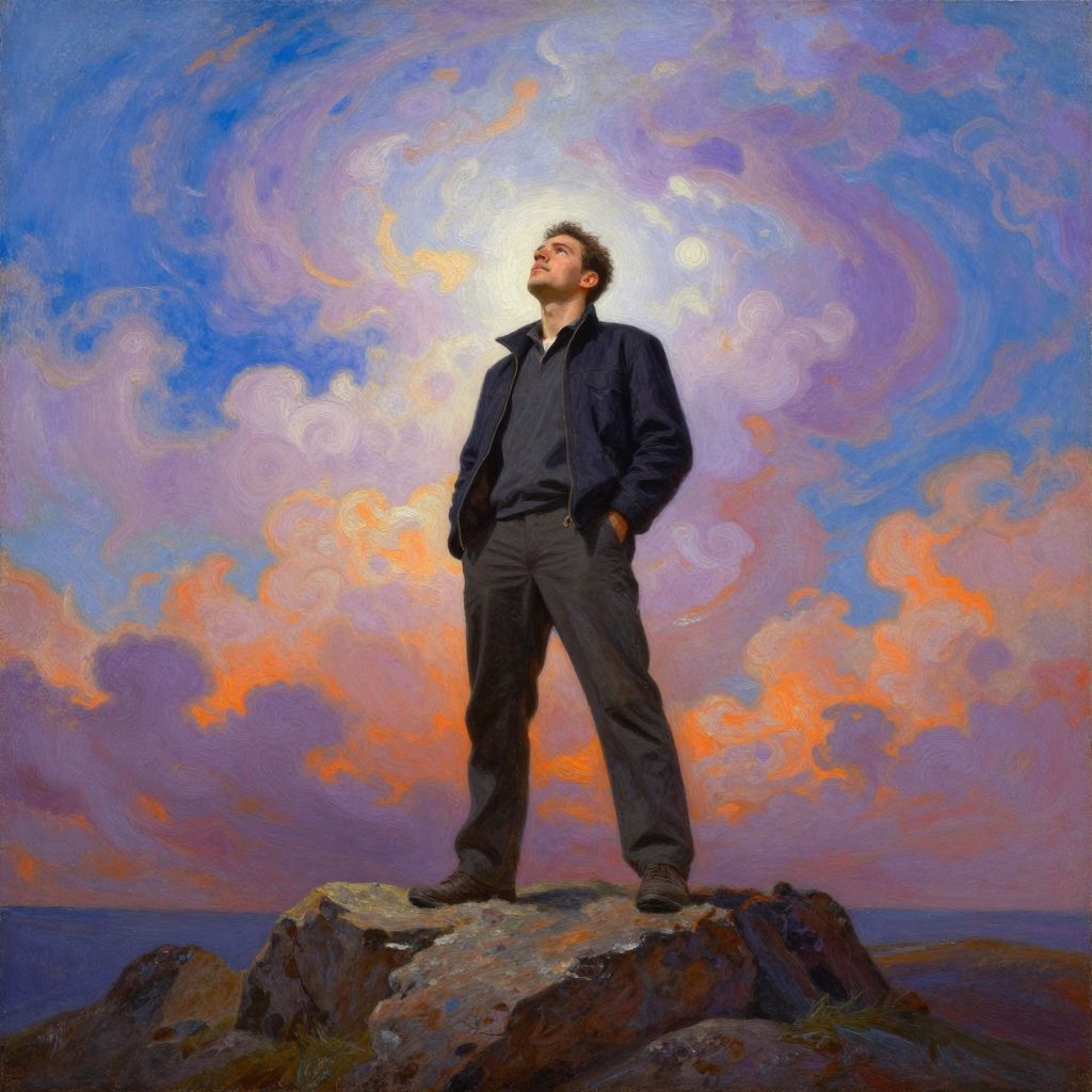 A weathered coastguard veteran with a rugged face stands resolute against the forces of nature. Captured mid-stride, his foot firmly planted on a wooden deck, he faces crashing waves behind him. An abstract painting of swirling deep blues and greens surrounds him, resembling turbulent waters or stormy skies. This layered composition creates a striking contrast between the hardened man and the ethereal background, capturing both weariness and determination in his eyes.