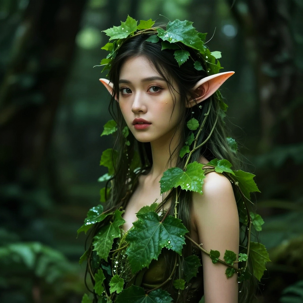 Photorealistic digital artwork of an ethereal, young Asian woman with long, dark, wet hair adorned with green leaves. She has large, pointed elf ears and wears a leafy crown and shoulder garland. Her skin is pale, and her expression is serene with slightly parted lips. She is partially nude, with visible cleavage, and the background is a dark, misty forest with blurred trees. The overall color palette is green and brown, creating a natural, woodland atmosphere. The texture of the leaves contrasts with her smooth skin, highlighting the fantasy element of the image.