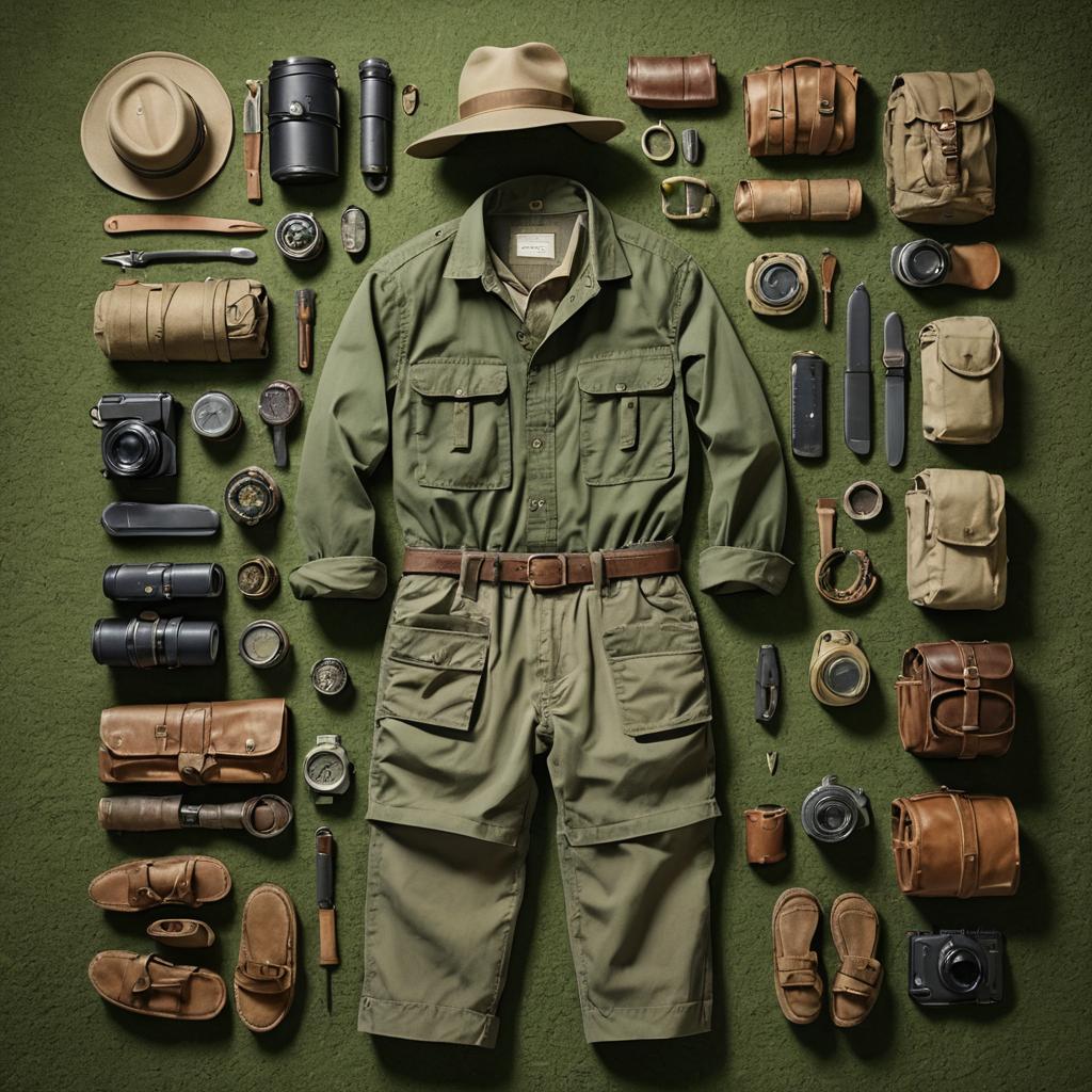 A rugged-built man with a fantail haircut is lying on green grass, dressed in an olive green long-sleeve safari shirt, wool blend khaki cargo shorts, a wide-brim hat, and leather sandals. He is surrounded by an array of vintage adventure and camping gear including leather bags, hats, binoculars, cameras, tools, and lanterns, arranged neatly on both sides, creating an artistic conceptual layout.