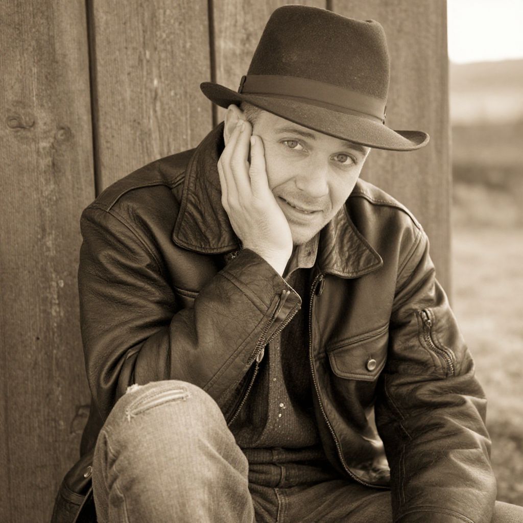 [[man,awkward picture]]Intimate, candid portrait, sepia-toned, soft focus, capturing an awkward moment, man's discomfort palpable, vintage attire, worn leather jacket, distressed denim jeans, weathered hat, rustic wooden backdrop, warm golden hour lighting, subtle shadows, nostalgic ambiance, 8x10 inches, fine art print. Man has masculine face and piercing eyes