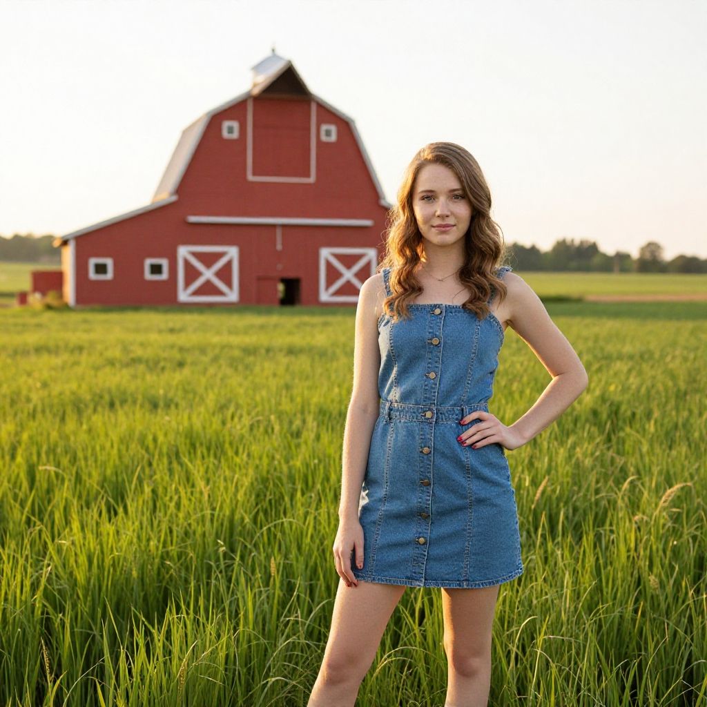 A young woman stands confidently in a vibrant green field with a picturesque red barn in the background. The golden hour light casts a warm glow, enhancing the serene rural landscape and her denim dress, embodying a sense of tranquility and connection to nature.