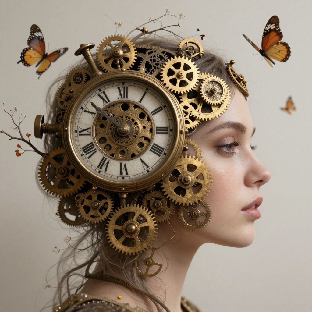 A steampunk-inspired clock, intricately woven with golden gears and cogs, emerges from the side of a serene woman's face, surrounded by fluttering butterflies and delicate branches, as if time itself is entwined with nature and dreams.