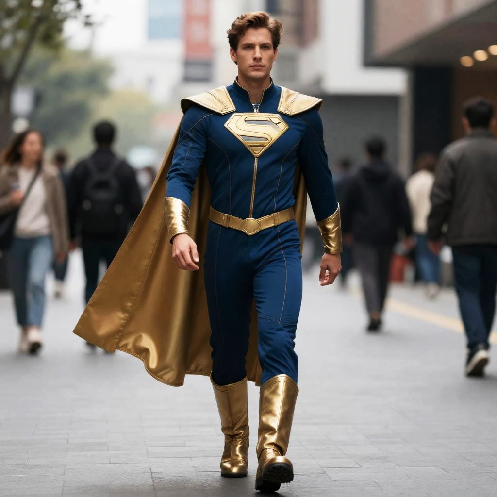 Adult apollo costume, man dressed in a silver and blue costume with a red cape