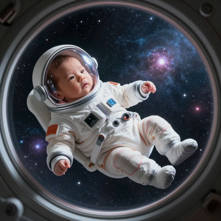 A serene newborn baby floats gracefully in a zero-gravity environment, encased in a soft, light-colored spacesuit, with a transparent helmet, against a backdrop of a starry cosmos visible through a circular window illuminated by distant supernovas.